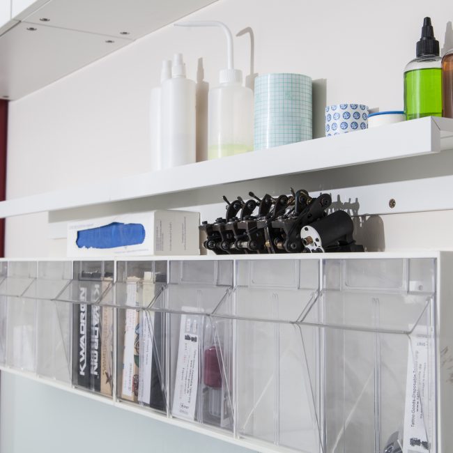 - Einwegprodukte wie Tattoo-Nadeln und -Griffstücke, Piercing-Nadeln, Handschuhe, Rasierer, Farbreste etc. werden direkt nach der Benutzung entsorgt.